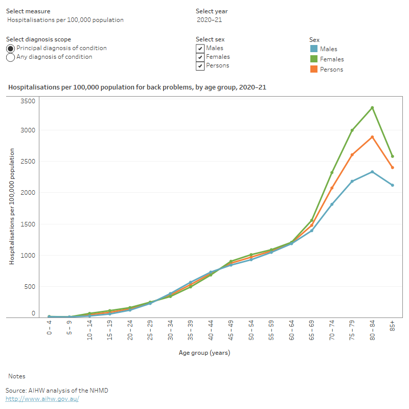Among males, back pain and problems were the second leading cause of disease burden for those aged 25–44 and 45–54 and the third leading cause for those aged 55–64. Among females, they were the leading cause for those aged 45–54 and the second leading cause for those aged 25–44.